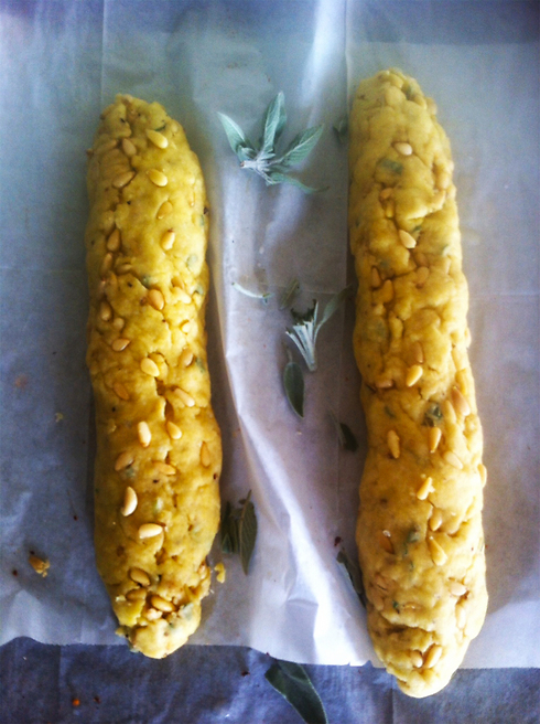 מערבבים את כל המרכיבים היבשים, ומוסיפים ביצים ושמן זית. לשים ½ דקה בלבד או עד שהבצק מתאחד. נזהרים לא ללוש יתר על המידה. יוצרים 2 נקניקים ארוכים, ומניחים אותם על ניירות אפייה. אופים בתנור שחומם מראש ל-180 מעלות במשך כ-20 דקות. מוציאים ונותנים להם כ-1/2 שעה מנוחה. חותכים באלכסון לפרוסות די עבות (1 ס"מ בערך), ומסדרים את העוגיות על נייר אפייה. מכניסים לאפייה שנייה בטמפרטורה של 150 מעלות במשך כ-15 דקות. בגמר האפייה מכבים את התנור, ומשאירים את העוגיות המלוחות להתייבש עם דלת תנור פתוחה במשך כ-1/2 שעה.